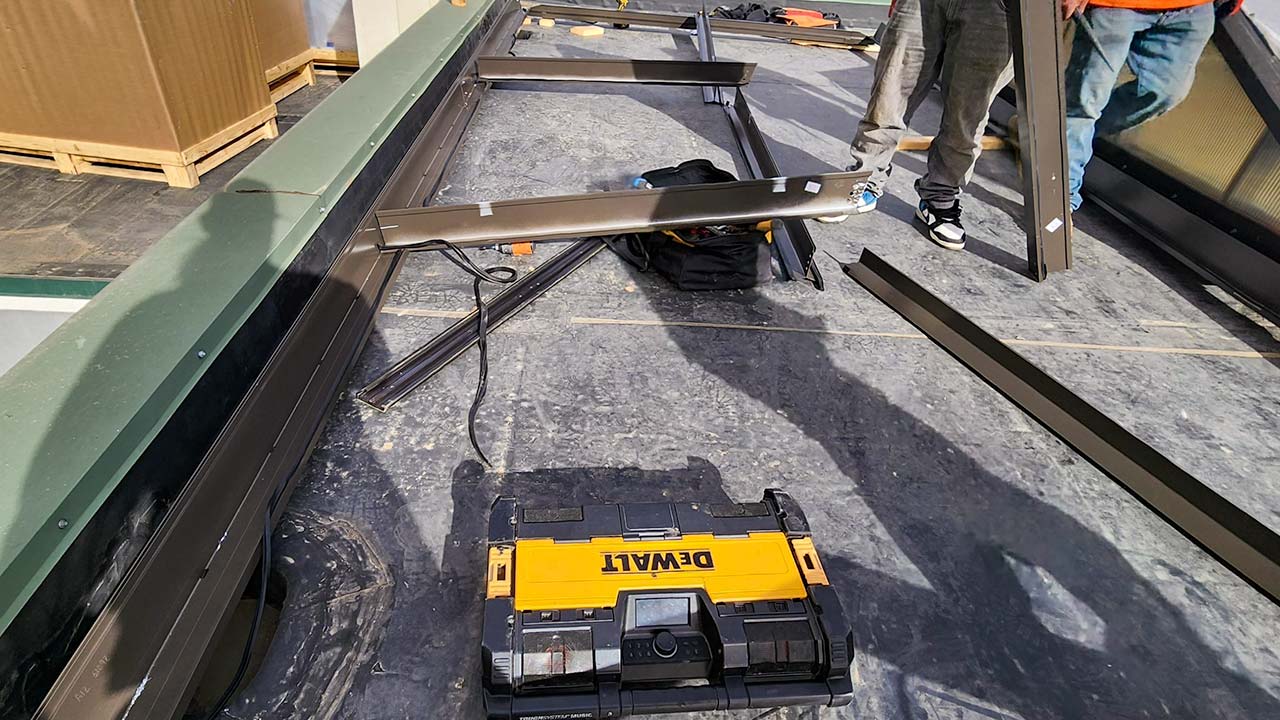 New skylight frames are pre-assembled on the roof prior to demolition allowing for as little exposure time as possible.