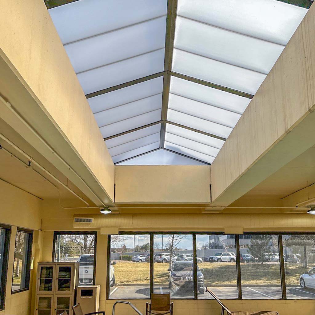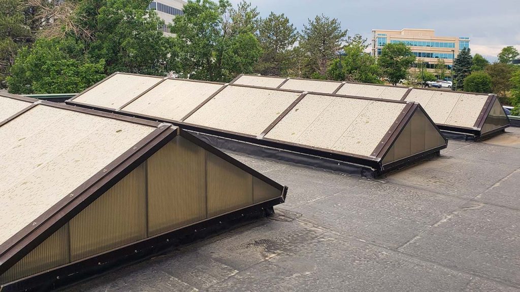 The skylights have suffered from UV Rays and from hail stones. Fortunately, the existing system had multi-wall glazing preventing damage into the interior.